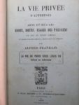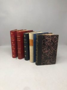 Ensemble de 5 volumes : - BAINVILLE (Jacques), Jaco et Lori, 7ème éition, Grasset, 1927, in-12 Certainement ancienement broché, non numéroté. Demi chagrin rouge, dos à nerfs et titre doré, bon état. - GOZLAN (Léon), Moeurs théâtrales, La comédie des comédiens, éditions Victor Lecou, 1853, In-12 Demi chagrin brun foncé, dos à nerfs et caissons dorés ornés d'entrelacs. - HUGO (Victor), Hernani - Le roi s'amuse, édition Ernest Flammarion, Paris, In-12 Demi chagrin rouge, dos à nerfs et caisson ornés d'une fleur dorée, titre doré. - LEMONNIER (Caille), Tante Amy, edition Fasquelle, 1906, in-12 Demi chagrin bleu, dos à nerfs et caisson ornés d'une fleur stylisées dorées, titre doré. - FRANKLIN (Alfred), La vie privée d'autrefois, arts et métiers du XIIème au XVIIIème siècle la vie de Paris sous Louis XV devant les tribunaux, Plon, Nourrit et Cie, 1899, In-12 Reliure textile bleu, pièce de titre rapportée.