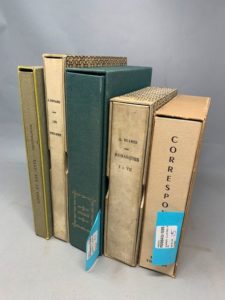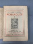 Réuni /657 OUVRAGES SOUS EMBOITAGES ET ILLUSTRES MODERNES DE MONTESQUIEU, Essai sur le goût, dans les choses de la nature et de l'art, Editions A & P Jarach, 1945, avec les compositions de Jean-Denis Malclès, gravées sur bois par Gilbert Poillot, sous emboitage, In-8 Un des 450 exemplaires sur vélin d'arches, ici numéroté 156 Bon état, emboitage légèrement usé RENARD Jules, Les philippe, précédé de Patrie, décorés de 101 bois originaux dont 8 camïeux de Paul Colin, edition d'Art Edouard Pelletan, Paris, 1907, In-4, sous emboitage Emboitage accidenté, traces d'humidité, intérieur en bon état, légère trace d'insolation Exemplaire numéroté 778 (manuscrit) RICHARDSON Humphrey, La vie sexuelle de Robinson Crusoé, illustrations de Francis Dumoulin, Editions du Cercle du Livre Precieux, 1963, In-4, Numéroté 639, dans son emboitage, très bon état SUARES André, Remarques, Tome 1 à 7 dans son emboitages, Editions de la Nouvelle revue Française, Paris, 1917, numéroté 704, In-8 Etat d'usage, trace d'humidité à l'emboitage TOLSTOÏ Léon, Lettres présentées, traduites et annotés par Benjamin Goriely, Tome 1 1842-1860, Edition de Paris, 1954, I-12, tirage à 15 exemplaires sur papier d'ingres des papeteries de Lana, ici numéroté IV Très bon état