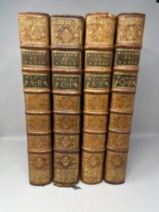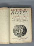 BAYLE (Pierre). Dictionnaire historique et critique. Quatrième édition, revue, corrigée et augmentée, avec la vie de l’auteur par M. des Maizeaux. Amsterdam, Brunel, Wetstein& Smith, Waesberge, Humbert, Honoré, Chatelain, Mortier ; Leyde, Samuel Luchtmans, 1730. 4 volumes in-folio, veau fauve, dos orné, pièces de titre olive et de tomaison noire, tranches rouges (Reliure de l’époque). Portrait de l’auteur gravé sur cuivre. Ce dictionnaire encyclopédique est l’œuvre la plus importante du philosophe et érudit protestant. Jolie reliure de l’époque, le dos décoré avec goût. Accroc à une coiffe, charnières et mors fendus à deux volumes.