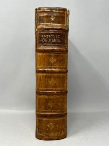 DU BREUL (Jacques). Le Théâtre des Antiquitez de Paris. Paris, Par la Société des Imprimeurs, 1639. In-4, veau fauve, double filet doré, dos orné, pièce de titre rouge (Reliure de l’époque). Édition en partie originale de cet ouvrage estimé sur la ville de Paris. Travail de vers à la fin du volume. Restauration à la reliure (caisson supérieur et haut des plats). Ex-libris manuscrit sur le premier plat.