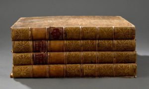 LA FONTAINE. Fables choisies. Paris, Desaint et Saillant, Durand, 1755-1759. 4 volumes in-folio, veau marbré, triple filet, dos orné (Reliure de l’époque). Célèbre et superbe édition, illustrée d’un frontispice et de 275 figures gravées sur cuivre d’aprèsJean-Baptiste Oudry. Exemplaire de premier tirage. Quelques feuillets roussis. Plats détachés, plusieurs pièces manquantes aux dos.
