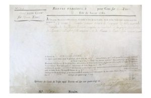 RENTE. - Contrat de rente viagère, daté de Paris le 31 mars 1785. 245 x 360 mm. Beau document sur vélin, imprimé, complété et signé à la plume. Joseph Micault d'Harvelay, conseiller du Roi et garde du Trésor royal, atteste avoir reçu comptant de Adriaan de Ruyter, premier clerc à la Compagnie des Indes orientales, chambre de Delft, la somme de 2000 livres pour la souscription d'une rente viagère sur 2 têtes.