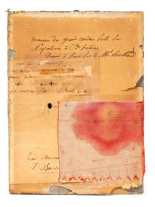 SOUVENIRS HISTORIQUES DE L'EMPEREUR NAPOLÉON Ier Composés d'un rare morceau de l'extrémité d'un grand cordon de l'Ordre de la Légion d'honneur en soie moirée rouge de l'empereur Napoléon, et d'une mèche de ses cheveux collée par une empreinte de cire noire. Ils sont fixés sur un papier avec inscriptions anciennes en partie cachées mentionnant : « Morceau du grand cordon porté par Napoléon à Ste Hélène. Donné à Paris par le M(aréch)al Bertrand »/« Pour Monsieur Delsarte» ; et « Ayez soin de ce trésor ! Ces cheveux m'ont été donnés par le valet de chambre de l'empereur, je vous en donne la foi de C. (croix) et m. f. (?) n'en doutera pas. H. Jolly C. (croix) ». Morceau de cordon : H. 9 cm. Papier : H. 22 cm. Taches et déchirures. Provenance : - François Alexandre Nicolas Chéri DELSARTE (1811-1871). - Son fils, Henri François DELSARTE (1834-1902). - Puis par descendance. Historique : François Delsarte (Solesmes, 1811-Paris, 1871), chanteur et pédagogue et théoricien du mouvement français. Au coeur de ses travaux sont les relations entre le geste et la musique, l'acteur et le spectateur, la langage rythmique du corps. Il réinvente les façons de bouger sur scène et de transmettre les émotions à travers le chant et la danse. Son approche innovante inspira au XXe siècle les metteurs en scène du cinéma muet et du théâtre, les compagnies de la danse moderne américaine et même les mouvements tels que Dress Reform visant à alléger les lourds costumes de femmes. Sa vision reposait sur une idée de trinité dont les trois composants en l'homme physique étaient la vie, l'âme et l'esprit. Appliquée au corps, cette trinité donnait aux membres l'expression de la vie, le torse symbolisait l'âme tandis que la tête l'esprit. Ses enseignements ont joué un rôle fondamental dans le domaine des arts de la scène européenne ainsi qu'aux États-Unis. Il chanta devant l'empereur Napoléon III en mars 1850.