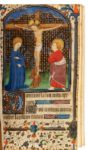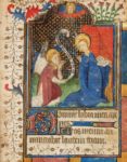 Heures dites d'AUGER LIVRE D'HEURES (à l'usage de Paris ou Saint-Pol-deLéon ?). En français et en latin, manuscrit enluminé sur parchemin. France, sans doute Bretagne (Nantes ?), vers 1420-1430. Avec 4 grandes miniatures attribuables au Maître du duc François Ier (de Bretagne). 146 ff., précédés par 3 feuillets de garde de papier et suivis de 2 feuillets de garde, quelques manques, notamment une miniature entre les ff. 93v-94 et manque en fin de manuscrit (collation : i12, ii8, iii8, iv8, v8, vi8, vii8, viii8, ix8, x8, xi8, xii7 (8-1, manque ii), xiii8, xiv8, xv8, xvi8, xvii8, xviii8 [manque certainement un cahier ou quelques feuillets après le dernier cahier]), quelques réclames (ff. 68v, 99v, 123v, 131v), écriture gothique à l'encre brun foncé, rubriques en rouges, réglure à l'encre rouge pâle, texte copié sur 14 lignes (justification : 60 x 90 mm), bout-de-lignes en bleu et rose foncé avec or bruni et rehauts blancs, nombreuses initiales à l'or sur fonds bleu ou rose foncé avec rehauts blancs (1- à 2 lignes de hauteur), plus grandes initiales de couleur rose ou bleu sur fond d'or avec décor de feuilles colorés et rehauts blancs introduisant les grandes divisions liturgiques, initiales prolongées par des baguettes et un décor enluminé dans les marges composé de rinceaux, de besants, de fleurs et de feuillages d'acanthe de couleur, avec 4 GRANDES MINIATURES de format cintré inscrites dans des bordures enluminées (baguettes dorées et colorées, rinceaux, besants et feuillages d'or, feuilles d'acanthes, bouquets de fleurs). Reliure de veau brun glacé, dos lisse orné, motifs dorés (fleurons, frises, hachures, ovales), décor doré sur les plats formé de quatre écoinçons aux angles avec fers hachurés, médaillon central avec rubans et fers ajourés sur fond hachuré, semé de fleurs de lis, tranches dorées guillochées (reliure de la toute fin du XVIe siècle, début XVIIe s.). Manque de cuir au dos (caisson supérieur accidenté), mors fendus, quelques manques de cuirs sur les coupes, reliure méritant une restauration mais conservant ses éléments d'origine. Feuillets rognés courts par endroits, affectant par moments les bordures des pages enluminées mais sans toucher les miniatures. Miniatures avec quelques écaillures ou taches, sans gravité. Quelques feuillets tachés. Dim. de la reliure : 100 x 142 mm ; Dim. des feuillets : 94 x 135 mm. Provenance : 1. Manuscrit copié et enluminé à première vue pour l'usage liturgique de Paris (Heures de la Vierge et Office des morts) mais peint par un artiste breton (?) identifié comme le « Maître du duc François Ier (de Bretagne) » (voir König, 1982 ; Avril et Reynaud, 1993, p. 114 et p. 175). Par ailleurs, il appert que ces Heures furent copiées pour un commanditaire avec des attaches bretonnes, si l'on retient en rouge au calendrier saint Yves et en rouge saint Nicolas (9 mai) et plus encore dans les litanies l'inclusion des saints : Nicolas, Ronan (dont le culte est très développé en Bretagne), Corentin et Yves (voir fol. 91v). De plus signalons que l'usage liturgique de Saint-Pol-de-Léon est presque identique à celui de Paris et que dans le cas présent plusieurs collectes relevées par Drigsdhal pour l'usage liturgique Saint-Pol-de-Léon se retrouvent dans notre manuscrit (ces collectes sont signalées en vert dans le relevé de Drigsdhal). Citons à ce propos E. Drigsdhal : « Books of Hours for Saint-Pol-de-Léon poses a delicate problem. The use of Saint-Pol-de-Léon was from the 14-15th century identical with the Use of Paris and can only be distinguished from Paris by a great number of Breton saints in the calendar and the litany (no early source with a different office has survived or been identified). Some books of hours have been catalogued or sold as « Paris, with an unusual large number of saints from Brittany. They were beyond doubt intended for use in the diocese of Saint-Pol-de-Léon [...] Earlier manuscript books of hours testify that the adaptation perhaps had taken place already in the 14th century. A number of Breton saints in the litany is the only difference: Paule, Goluine, Joeuine, Tenenane, Senane, Tugduale (Tudguale), Brioce, Guillerme, Maclovi, Paterne, Corentine, Ronane, Cognogane, Maudete, Gildasi, Guengaloee ». http://manuscripts.org.uk/chd.dk/use/hv_poldeleon.html 2. Plusieurs inscriptions de provenances anciennes, du XVIe au XXe siècle (gardes supérieures). Ces inscriptions permettent de suivre les propriétaires successifs du XVIe siècle au XXe siècle, rattachant un temps les présentes Heures à la petite ville de Saint-Aubin-du-Cormier (dept. Ille-et-Vilaine) située au nord-est de Rennes. Dans l'ordre on relève : « Ces Heures estoient en 1540 a la grande mère de mon père Desbouexiere Auger de St Aubin du Cormier. 1698 ». - « Jean-Baptiste Thomas Auger pro[cureur] du roy de St-Aubin du Cormier en 1731... ». - « Jean Baptiste Auger avocat en la cour en 1767 fils du precedent et petit fils de Me des Bouexiere et arrière petit fils de laditte Gillette Huart ». - «