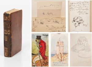Amicorum d'autographes et de dessins de diverses personnalités. Dont : Clémenceau, Gervex (dessin), Gaston Guédy, Robert de Flers, Pierre de Nolac, Comtesse de Béhague, Maréchal Foch, Général Weygand, Millerand, Madame Millerand, Maréchal Franchet d'Espèrey, Maréchal Fayolle, Maréchal Liautey, Jacques Blanche, Henri de Régnier, Paul Valéry, Reine Amélie, Duce de Montpensier, Raymond Poincarré, Maréchal Joffre, Forain (dessin soldats), Madeleine Lemaire (aqu. oeillets), Helleu (gravure, sign. gravée), Général Mangin, Roi & Reine de Roumanie, Roi du Portugal, Aristide Briand, Cécile Sorel, Henry Bordeaux, Reine de Hollande, Roi & Reine de Belgique, Marcel Prévost, Gaston Domergue, André Tardieu, Albert Lebrun, Sacha Guitry, André Sigfried, Comte d'Ormesson, Massenet.... Un vol. in-12. 105 fol., dont certaines blanches avec collages. Ex libris Vicomte de Dampierre, Bibliothèque de Coësme (1921). Remploi d'une ancienne rel. en basane à dos à caissons dorés, et pièce de titres «Memorial, 1921» (date sur-écrite), dans un emboîtage. Quelques taches ; rel. accidentée avec manques au dos ; emboîtage usé.