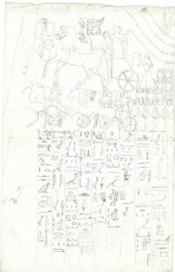 Léon de JOANNIS (1803-1868) JOANNIS lieutenant de vaisseau, commandant en second du Luxor qui apporta l'obélisque à Paris. 5 dessins à la mine de plomb ; sur 5 feuillets vergé (37 x 23 cm). Relevé pour Champollion de bas-reliefs et de hiéroglyphes à Louxor. Les dessins sont conservés sous une chemise portant l'inscription « à monsieur Champollion ». Sur le premier dessin, Champollion-Figeac a noté : « Pylone à gauche de Louqsor Dessin par Mr de Joannis second du batiment Le Louxor en 1832 ». On joint : Un imprimé Érection de l'obélisque (Paris, impr. de Paul Dupont et Cie, [1836] ; in-4 de 4 p. orné de 2 vignettes (mauvais état, fentes et déchirures).