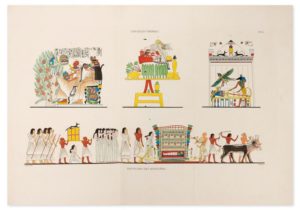 CAILLIAUD Frédéric (1787-1869) Recherches sur les arts et métiers, les usages de la vie civile et domestique des anciens peuples de l'Egypte, de la Nubie et de l'Ethiopie. Ouvrage dédié au Roi. Paris, Debure, 1831, in-4, demi-rel. veau fauve, dos lisse, orné de palmettes dor. couv. conserv. ill (mors us. et dos légèrement décol.). Rare album tiré à petit nombre, paru en livraisons chez Debure en 1831, accompagné de la couverture rose imprimée et 89 planches gravées et finement coloriées dont quelques-unes en noir, sans texte. Incomplet de la carte repliée qui manque souvent. Cet ouvrage presque qu'inconnu, n'a été tiré qu'à cent exemplaires dont une moitié fut détruite en raison de l'éboulement du magasin où elle était déposée.
