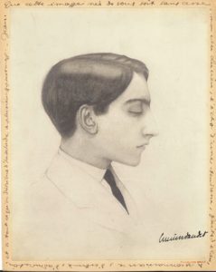 Jean COCTEAU (1889-1963) Portrait avec dédicace autographe signée. 30 x 24 cm. Reproduction photographique (procédé Druet) de son portrait par Lucien DAUDET, signé par ce dernier, et entourée de cette dédicace : « Que cette image née de vous soit sans cesse, mon cher Lucien, l'écho d'une tendresse, faite d'élan, de reconnaissance, d'estime, d'admiration, et de tout ce qu'on distribue d'habitude à plusieurs personnes. Jean ».