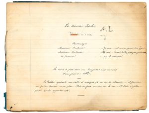Alphonse DAUDET (1840-1897) Manuscrit autographe, La dernière Idole, [1861] ; cahier oblong in-4 (20 x 26 cm). Manuscrit de travail d'une des toutes premières oeuvres de Daudet. Ce drame en un acte, en collaboration avec Ernest L'Épine (1826- 1893), a été créé avec succès à l'Odéon le 4 février 1862 par Hippolyte Tisserant et Rosélia Rousseil. La pièce fut écrite au début de juillet 1861. Selon J.-H. Bornecque, la part de L'Épine « y demeure assez mince [...] il joua surtout un rôle de régisseur et de garant ». Le manuscrit, sur papier ligné, est incomplet des deux dernières scènes (V et VI). Il est rédigé d'une petite écriture serrée et présente de nombreuses ratures et corrections, et des variantes avec le texte définitif. Le sous-titre « comédie » a été biffé et remplacé par « drame ». Des indications sur les personnages seront modifiées ou supprimées dans l'édition : Ambroix « 70 ans, vert encore pour son âge », Mme Ambroix « 45 ans. Encore belle, quoique grisonnante ». Quelques petites remarques marginales semblent correspondre à la participation de L'Épine : « toute cette tirade peut s'enlever si la scène est trop longue » ; « Enfin de quoi est-il mort ? la suite doit me le dire »...