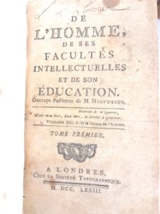 HELVETIUS — « De l’homme, de ses facultés intellectuelles et de son éducation » — A Londres, 1773, ensemble de 4 volumes in-12 reliés plein beau granité du temps, dos à nerfs ornés, gardes couleurs, pièces de titre et de tomaison,...