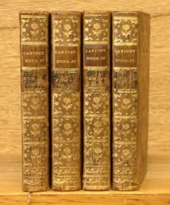 L'Intrigue du Cabinet sous Henri IV et Louis XIII, terminée par la Fronde. P., Moutard, 1780, 4 vol. in-12, [8]-LXXXIV-358-[2], [2]-XII-456-[2], [2]-432-[2], [2]-IV-408 p., plein veau marbré de l'époque, dos lisses entièrement ornés de motifs dorés, pièces de titre et de tomaison (ces dernières frottées), tranches rouges (2 petites déchirures, piqûres éparses au t. 1, coins usés, sinon bel ex.). L'auteur était un des meilleurs connaisseurs de la période de la Ligue.