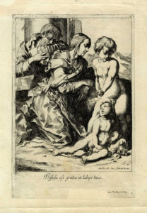 Pierre Brebiette, Sacra Famiglia con San Giovannino. 1630-1650. Acquaforte. mm 270x182. Foglio: mm 340x235. IFF, 12. Da Andrea del Sarto. Sulla lastra in basso a destra "Andrea del Sarto fatta in Roma", al margine inferiore al centro "Diffusa est gratia in labÿs tuis" e al di sotto traccia dell'asportazione dell'excudit di Quesnel seguita dal privilegio reale. Ottima impressione su carta vergellata sottile con filigrana "piccolo cartiglio rettangolare con lettere". (1)