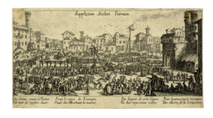 Jacques Callot, Supplicium sceleri Fraenum. Les supplices. 1624-1634. Acquaforte. mm 115x216. Lieure, 1402. La lastra non è datata e, poiché i primi quattro stati non riportano l'excudit di Henriet, è probabile che sia stata incisa prima del 1630 (data che segna l'inizio della collaborazione tra l'editore e l'artista). Meaume la data già al 1624 mentre Lieure ne colloca l'esecuzione nell'anno 1634. Bellissima impressione nel III stato di 8 dopo la comparsa delle due finestre e dei tratti definitivi sulla piccola torre quadrata in fondo alla piazza. Carta vergellata sottile con filigrana "angelo"(Lieure, 26-28). (1)