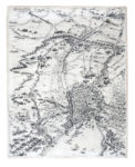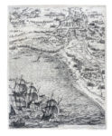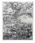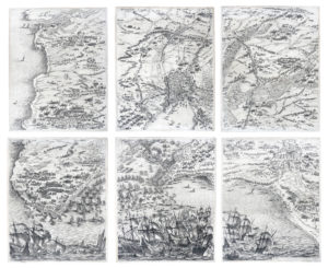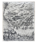 Jacques Callot, Siège de la Rochelle. 1630. Acquaforte in 6 lastre. mm 560/565x430/446. Lieure, 655. Sei fogli componenti la parte centrale della grande incisione (mancanti le dieci tavole di bordura). Con la firma "Jac. Callot fe." in basso sulla lastra centrale della fascia inferiore. Ottime prove nello stato definitivo dopo la comparsa delle lettere di riferimento agli angoli superiori di ciascuna tavola. Carta vergellata apparentemente priva di filigrana. (6)