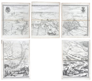Jacques Callot, Tabula Obsidionis Bredanae / Le Siège de Breda. 1628. Acquaforte. mm 545/656x462/490. Lieure, 593. Cinque delle sei tavole (mancante la tavola centrale al registro inferiore) raffiguranti l'assedio di Breda, opera commissionata a Callot da Isabella Clara Eugenia d'Asburgo - infanta di Spagna e di Portogallo (Segovia, 1566 – Bruxelles, 1633), che governò, come principessa sovrana, i Paesi Bassi spagnoli - e pubblicata dall'editore Plantin ad Anversa. Bellissime impressioni, tre nell'unico stato (tavole in alto e in basso a sinistra e in alto a destra), in I stato avanti la grande banderuola con il titolo la tavola in alto al centro, in II stato la tavola in basso a sinistra dove oltre la firma "Iac. Callot in / et fecit" si legge "Israel Silvestre ex. Parisiis Cum privil. Regis". Carta vergellata con grande filigrana "croce di Malta entro corona di rosario con croce pendente" visibile su tutti i fogli. (5)