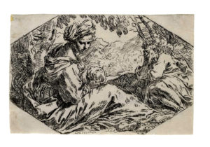 Simone Cantarini, Riposo in Egitto. 1637-1639. Acquaforte. mm 80x124. Bartsch, 7. Bellini (Cantarini), 16. Incisione in ottagono su lastra rettangolare senza alcuna sigla o iscrizione. Ottima prova nell'unico stato stampata con inchiostrazione brillante su carta vergellata sottile priva di filigrana. (1)