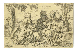 Simone Cantarini, Sacra Famiglia con Sant'Elisabetta e San Giovannino. 1639. Acquaforte. mm 124x190. Bartsch, 10. Bellini (Cantarini), 21. Ottima impressione nel II stato di 2 dopo la comparsa della scritta in basso al centro "G. Renus. in. et fec." e sulla destra dell'indirizzo "J. Robillant ex.". Carta vergellata pesante priva di filigrana. (1)