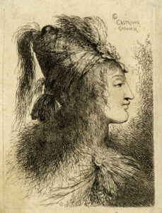 Giovanni Benedetto Castiglione (detto il Grechetto), Testa di donna di profilo verso destra. 1645-1650. Acquaforte. mm 110x82. Foglio: mm 120x90. Bartsch, 47. Bellini (Castiglione), 38. In alto a destra il monogramma e "CASTILIONE / GENOVESE". Tavola dalla serie cosiddetta dei Piccoli ritratti iniziata probabilmente a Genova e poi continuata a Roma databile pertanto tra il 1645 e il 1650. Ottima impressione nell'unico stato su carta vergellata lievemente rigida e priva di filigrana. (1)
