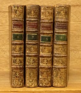 Histoire de la vie de Henri IV, Roi de France et de Navarre. 3e édit. revue, corrigée et augmentée. P., Nyon, 1779, 4 vol. in-12, 424 (les 18 premières paginées en chiffres romains), 408, 411-[1 blanche], 450-[6] p., 1 frontispice au t. 1 représentant Henri IV, gravé par Chenu et 9 gravures h. t., plein veau marbré de l'époque, dos à 5 nerfs ornés de caissons dorés, pièces de titre et de tomaison en maroquin rouge et vert, tranches rouges (1 mors et 1 coupe abîmés, épidermure à 1 plat, coins usés, piqûres éparses). Historien et jurisconsulte français, Richard de Buri (1730-1794) s'est surtout illustré dans la rédaction de biographies consacrées à certains rois de France, comme Louis XIII et Henri IV. Cette édition contient la fameuse préface assez critique envers les historiens qui lui attira les critiques de La Beaumelle. Les gravures représentent des personnages importants du Royaume de France à cette époque : Armand de Gontaut, le Duc de Joyeuse, Crillon, Gabrielle d'Estrées, Sully, la Marquise de Verneuil...