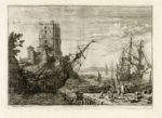 Adrien Manglard, Cinque soggetti navali. Roma: Luigi Fabri, 1753. Acquaforte. mm 220/225x308/315. Foglio: mm 310x404/410. Robert-Dumesnil,II, 4,6,9,10,12. Cinque tavole tutte firmate al margine in basso a sinistra con data e luogo, da Diverse Compositioni e Vedute inventate ed intagliate da Adriano Manglard in Roma l'an. 1753. Ottime impressioni avanti la numerazione, su carta vergellata pesante con filigrana "fiore di giglio in cerchio singolo sormontato da lettere CB" visibile su uno dei fogli. SI AGGIUNGE: Reijnier Nooms (detto Zeeman)(Amsterdam, 1623-1667) [da]. Due grandi navi da guerra olandesi. Acquaforte. mm 198x296. Al margine in basso a sinistra "N De Poilly ex. C.P.R.". Copia in controparte da tavola della serie "Tredici scene navali" (1650-1667 ca.). (6)