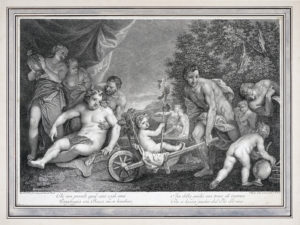 Joseph Wagner, Due scene bacchiche. 1763. Acquaforte e bulino. mm 335x470. Con il montaggio: mm 425x550. Le Blanc, 71. Al margine inferiore a sinistra "Apud Nob.os Viros Lini Gregorius Lazarini Pinxit ", a destra "I.Wagner Sculp. et vend. Ven.is C.P.E.S.", al centro 4 versi su due colonne e all'angolo inferiore a sinistra "25-1" e "25-2". Due tavole da una serie di quattro Baccanali tratti da dipinti di Gregorio Lazzarini (Venezia, 1655-Villabona veronese, 1730). Belle prove su carta vergellata pesante. (2)