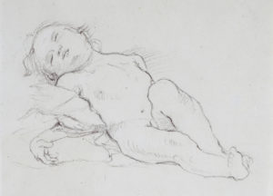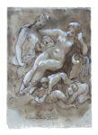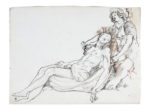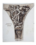 Autori vari, Cinque disegni varie epoche. 1) Anonimo XVIII secolo. Due esercitazioni sui pennacchi del Domenichino con San Matteo e San Luca in Sant'Andrea della Valle. Penna e inchiostro bruno, pennello e acquerello marrone, su carta vergellata. mm 295x250. 2) Anonimo XVIII secolo. Due figure femminili e giochi di putti. Penna e inchiostro marrone, pennello e acquerello marrone chiaro, rialzi in bianco. Carta vergellata pesante. In basso "Vittorio Maria Bigari". mm 203x143. Disegno ripassato successivamente a pennello e acquerello. 3) Anonimo primo quarto XIX secolo. Cristo morto sorretto dall'angelo. Penna e inchiostro nero, pennello e acquerello marrone. Carta bianca non vergellata. mm 143x193. 4) Anonimo XIX secolo. Putto dormiente. Matita nera su carta bianca non vergellata. mm 160x212.