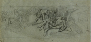 Autori vari, Lotto di tre disegni XVIII-XIX secolo. 1) Deposizione nel sepolcro. Matita nera su carta azzurra. mm 187x388. 2) Ritratto di giovinetta e stemma con elmo e sirena. Matita nera su carta vergellata azzurra con filigrana "lettere FA". mm 265x190. 3) Uomo con la testa riversa e la bocca socchiusa. Olio su carta applicato su tavoletta. mm 120x103. (3)