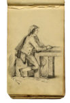 Autori anonimi metà sec. XIX, Due taccuini con pensieri e appunti di viaggio. 1830-1870. In 24° album (mm 120x200 e 125x190). Lotto di due piccoli album: un liber amicorum contenente dediche, pensieri brevi, poesie, piccole vedute come appunti di viaggio e numerosi disegni tra i quali da segnalare un piccolo acquerello di Giuseppe Moricci (Firenze, 1806-1879) firmato e datato 1835, altro con la firma di Gaetano Palazzi (Bologna, 1830-1892). L'altro album si presenta come taccuino di un viaggiatore inglese che appunta ad acquerello i paesaggi e i personaggi incontrati durante il suo viaggio in Italia. Legature con dorso in pelle e piatti in carta decorata. (2)