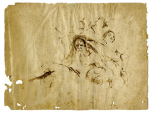 Francesco Salvatore Fontebasso [attribuito a], Studio per divinità fluviale. Penna e inchiostro bruno, pennello e acquerello marrone, carta vergellata sottile color sabbia priva di filigrana. mm 192x250. Al verso nota manoscritta a matita di grafite "Acquistato li 22 Marzo 1822 Giu[sep]pe Fabbrini", e nota di possesso non identificata a penna e inchiostro blu. (1)