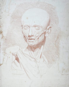 Jean-Antoine Houdon [cerchia di], Testa di scorticato. 1767 ca. Matita rossa su carta vergellata sottile con filigrana "piccolo grappolo d'uva" e "lettere CM inframezzate da cuore". (Parigi, 1752-1800). mm 545x433. (1)
