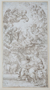 Petro Giacomo Palmieri, Daniele nella fossa dei leoni. Penna e inchiostro bruno su carta vergellata sottile con filigrana "testa coronata entro ovale". In basso a sinistra a penna e inchiostro bruno "Pietro Palmieri fece". mm 423x224. Dal dipinto di Pietro da Cortona eseguito tra il 1663 e il 1664 per la chiesa veneziana di San Daniele e oggi conservato presso le Gallerie dell'Accademia (inv. 754). (1)