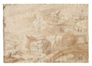 Lodewijk Toeput (Il Pozzoserrato), Paesaggio montuoso con rovine e due figure sedute. Penna e inchiostro bruno, pennello e acquerello seppia, tracce di matite di grafite, rialzi in bianco su carta vergellata color avorio. mm 235x345. All'angolo inferiore destro marchio della collezione di Paul Mathias Polakovits (Budapest 1921-Paris 1987), Lugt 3561. Provenienza: Sotheby's, Amsterdam, 15/11/1995, lotto 52. Christie's, South Kensington, 09/07/2009, lotto 532. Italia, collezione privata. (1)