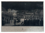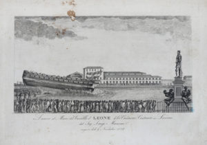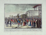 Giuseppe Piattoli Giuseppe Foraboschi, Prospetto dell'Incontro fatto dal Popolo Fiorentino a S:A:R il Gran-Duca Ferdinando III in compagnia di S. Manfredini il di 12 8bre: 1792; in segno del Popolare e Universale gradimento per la legge Frumentaria... 1792 ca. Acquaforte in coloritura. mm 247x328. Foglio: mm 318x408. Su disegno di Giuseppe Piattoli. Bella impressione su carta cerulea. SI AGGIUNGONO: Anonimo prima metà XIX secolo. Lancio al Mare del Vascello il Leone di 60 cannoni, Costruito in Livorno dal Sig. Luigi Mancini eseguito il di 9 Novembre 1826. Acquaforte. mm 315x455. Foglio: mm 355x505. / Giuseppe Ciardi (Prato 1788-1855/57), G. Carocci (Attivo a Firenze nella prima metà del XIX secolo ). Prospetto della processione del morto Redentore che triennalmente si eseguisce nella città di Prato nel venerdì santo... Acquatinta. mm 350x495. (3)