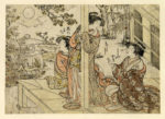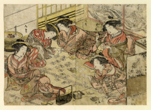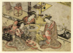Katsukawa ShunshŠ Kitao Shigemasa, Quattro tavole con gruppi di cortigiane da Seirô bijin awase sugata kagami (Specchio di Belle Donne delle Case Verdi). 1776 (An'ei 5). Xilografia a colori (nishiki-e). Formato: due pagine ôhon (mm 213/215x297/300). Editore: Tsutaya Jûzaburô e Yamazaki Kinbei. Data: 1776 (An'ei 5). Le quattro tavole provengono dal volume Seirô bijin awase sugata kagami (Specchio di Belle Donne delle Case Verdi) pubblicato congiuntamente da Tsutaya Jûzaburô e Yamazaki Kinbei, e progettato da Shigemasa e Shunshô, ma non è chiaro a quale artista si debbano le singole illustrazioni. (4)