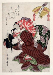 Kitagawa Utamaro, Amagoi komachi (Komachi prega per la pioggia). 1804-1805. Xilografia a colori (nishiki-e). Formato: ôban verticale (mm 363x250) Firma: Utamaro hitsu. Editore: Iseya Sōemon. Censura: kiwame. Serie: Fūryū nana Komachi (Sette eleganti aspetti della poetessa Ono no Komachi), con il titolo sul ventaglio in alto a destra. Nell'immagine la poetessa Ono no Komachi in kimono rosso a strisce si flette in avanti con un bambino sulla schiena per invocare la pioggia.. (1)