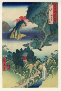 Utagawa Hiroshige I, Mikawa, Hôraiji sangan (Il tempio del monte Horaiji, nella provincia di Mikawa). 1853 (Kaei 6), ottavo mese. Xilografia a colori (nishiki-e). Formato: ôban verticale (mm 342x225). Firma: Hiroshige hitsu. Editore: Koshimuraya Heisuke (Koshihei). Censura: Kinugasa, Murata, Ox 8. Intagliatore: Yokokawa Takejirô (Hori Take). Data: 1853 (Kaei 6), ottavo mese. Serie: Rokujûyoshû meisho zue (Guida illustrata ai luoghi famosi delle oltre sessanta province). (1)