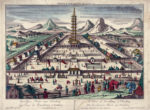 Georg Balthasar Probst [excudit], T'Keysers Hof van binnen in Pekin (L'Interiore del Palazzo del Imperatore di China a Peking) / Porcellyne Tooren van Nanking (Il Torre di Porcellana a Nanking). 1750. Acquaforte e bulino in coloritura. mm 305/320x425/430. Foglio: mm 333x450/480. Lotto di sette vue d'optique con soggetto luoghi notevoli della Cina, con Pechino e la Città proibita o d'invenzione: due disegnate da P. van Blankaert ed edite da Georg Balthasar Probst; altra raffigurante la Vue Perspective de la grande Place de Nankin edita da Dumont a Parigi nel 1760; Ceremonie de la grande Feste que les Chinois celebre le 24 de la Lune d'Aoust dans la principale Place de Pekin, Mondhare à Paris, 1775 (2 esemplari); altre due d'invenzione A Paris Chez Beauvais, 1770 ca. (7)
