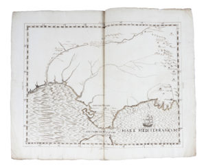 Anonimo della fine del XVII secolo, Fretum Herculeum nunc Estrecho di Gibraltar. Penna e inchiostro bruno, tracce di matita di grafite. Carta vergellata color avorio con filigrana "lettere B A in cerchio singolo sormontato da trifoglio". mm 505x637. (1)