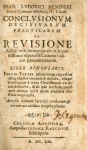 Conclusionum decisivarum practicarum de revisione actorum et sententiarum in Augustissimo Imperialis Camerae Iudicio pronuntiatarum. Liber singularis. Editio tertia [...]. Coloniae Agrippinae, Sumptibus Iodoci Kalcovi, 1659, in-12, [16]-582-[86] p., plein vélin à petits rabats de l'époque (papier fortement bruni). Johann Ludwig Bender (1587-1605) est un juriste allemand.