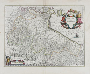 Willem Janszoon Blaeu, Romagna olim Flaminia. Amsterdam: 1640 ca. Incisione in rame in coloritura. mm 383x504. Foglio: mm 504x600. Dal terzo volume del Theatrum orbis terrarum. Testo tedesco al verso. In alto a destra il titolo entro elegante cartiglio decorativo. La mappa riporta la zona tra Rimini, Forlì, Cesena, Imola e Ravenna. (1)