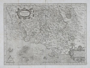 Giovanni Antonio Magini , Territorio di Siena. Bologna: 1606. Incisione in rame. mm 350x464. Foglio: mm 422x570. Titolo nel cartiglio in alto a sinistra, in basso a destra dedica al Marchese Piriteo Malvezzi governatore e luogotenente generale di Siena. Da L'Italia a cura di Fabio Magini, edita a Bologna nel 1620, dopo la morte del padre. (1)