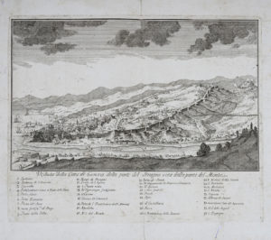 Anonimo del XVIII secolo, Veduta della Città di Genova dalla parte del Bisagno vista dalla parte del Monte. Acquaforte. mm 375x462. Foglio: mm 455x505. Veduta di Genova presa dalla piana del fiume Bisagno con descrizione della zona prima degli ammodernamenti susseguitisi nell'Ottocento. Si osserva il torrente ancora scoperto con il borgo di Bisagno e il ponte di sant'Agata, le antiche mura che raggiungevano la foce, l'acquedotto. Sotto la veduta legenda a 36 voci con nomi dei luoghi ed enumerate alcune postazioni difensive (2. Batteria di S. Giacomo, 15. Trincee de Genovesi,...). (1)