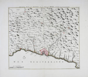 Reinier Ottens (Amsterdam, 1698-1750) & Joshua Ottens (Amsterdam, 1704-1765), Nouveaux Plan et Environs de la Ville de Genes. Amsterdam: Chez R. & I. Ottens, 1730 ca. Incisione in rame con la costa e le città in coloritura. mm 435x492. Foglio: mm 563x660. Tavola probabilmente proveniente dall'Atlas Maior pubblicato attorno al 1730. L'attività di produzione, pubblicazione e vendita di cartografia degli Ottens ebbe inizio con Joachim (Amsterdam,1663-1719), e dopo la sua morte proseguì con i figli Reiner (1698 -1750) e Joshua (1704 ? 1765) che tra il 1720 e il 1750 la portarono al successo. La produzione della bottega Ottens fu enorme, di fatto includeva copie di praticamente tutte le mappe sino ad allora prodotte e disponibili, raggiungendo il numero di oltre 800 lastre, raccolte in 15 volumi di atlanti. (1)