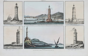 Autori vari, Quattro vedute del Porto di Genova. XIX secolo. Litografia/Acquatinta/Incisione in rame. Dimensioni varie. Si segnalano: Sei vedute di fari tra i quali quello di Genova e quello di Livorno. Da John Thomas Serres, The Little Sea Torch: Or, True Guide for Coasting Pilots: By Which They are Clearly Instructed How to Navigate Along the Coasts of England, Ireland, France, Spain, Portugal, Italy, and Sicily..., London 1801. / Paris Chez Gosselin e Lyon Chez Gadola, Gênes (Italie) fond du port. Incisione in rame e acquatinta a colori. mm 205x308. Foglio: mm 305x408. (5)
