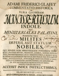 Commentatio historica de vera quondam Ministerialum indole, qua Ministeriales Palatini, praesertim vero Milites Imperii, aut Statum Nobiles, qui nomine olim ministerialium potissiumum veniebant, pristino nitori, dignitati, juribus, generis intergritati, eminentiae singulari et immunitatibus, a quibus quorundam recentiorum perversae doctrinae eos deturbaverant, restituuntur, eorumquae nexus militaris a vasalitico et subdititio distinctissimus ex genuinis medii aevi historiarum monumentis et documentis publicis eruitur. Accessit Index Instructissimus. Francofurti et Lipsiae, Apud Christophorum Riegel, 1724, petit 4°, [32]-395-[1 blanche-48] p. Relié avec : DALWIGK (Wilh. Frider. Ludovicus). De pactis ganerbinatum, vulgò Burg-Friede dictis. Maburgi Cattorum, Typis Philippi Casimiri Mülleri, [thèse présentée en mars 1725], petit 4°, 48 p. Ensemble un vol. en demi-vélin à coins de l'époque (mouill. marg. bruniss., signatures au titre, annotations anciennes). Publiciste et historien allemand, Adam Glafey (1697-1753) fit pendant plusieurs années avec succès des leçons publiques sur le droit naturel à Leipzig, et fut nommé en 1726 archiviste privé de la cour de Dresde.