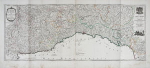 Georges Louis Le Rouge, L'Etat de la Republique de Genes Tiré des Meillieurs Cartes d'Italie... / Stato di Genova con altri adiacenti... Paris: Chez Le S.r Le Rouge Ingen.r Geographe du Roy, 1747. Incisione in rame (su due lastre) con confini in coloritura. mm 445x1014. Foglio: mm 555x1180. Grande mappa dello stato genovese stampata su due fogli uniti al centro. Da Atlas General pubblicato a Parigi tra il 1741 e il 1762. (1)