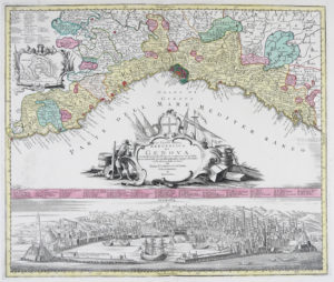 Tobias Conrad Lotter, Lo Stato della Repubblica di Genova Giusta la di lui divisione in contorno orientale et occidentale geograficamente rappresentato et di nuovo dato in luce da Tobia Cunrado Lottero Geographo in Augusta. Augusta: Tobias Conrad Lotter, s.d. [1760 ca.]. Incisione in rame in coloritura. mm 498x585. Foglio: mm 573x705. Mappa di grande impatto con elaborato cartiglio al centro contenente il titolo, altro in alto a sinistra con una pianta delle fortificazioni della città di Genova. In basso bella veduta della città presa dal mare con legenda dei luoghi a 64 voci. (1)