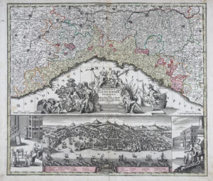 Georg Matthäus Seutter, Reipublicae Genuensis dominium cum inclytae istius Urbis et Portus insignioribus prospectibus geographica et topographica synopsi repraesentatum... Augsburg: Mattheus Seutter, 1735. Incisione in rame in coloritura. mm 498x575. Foglio: mm 535x640. Incisione divisa in due parti contenente nella parte superiore carta geografica della Liguria, in quella inferiore dettagliata veduta a volo d'uccello di Genova con legenda sottostante a venticinque richiami. In basso a sinistra riquadro con l'arte della tessitura. Al centro il titolo in latino entro grande cartiglio decorato con cherubini, allegoria di Genova e il dio Ermes. (1)
