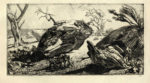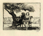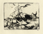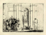 Pietro Annigoni, Incontri. 1938. Cartella in piena tela beige in formato oblungo (mm 272x385) composta da 24 acqueforti (lastre di varia misura, fogli: mm 268x378 cad). Tutte le incisioni sono firmate a matita in basso a destra, molte controfirmate in lastra ed alcune datate in lastra. Sono presenti: Autoritratto; Nello studio; Modella; Tentazioni di S. Antonio; Il tiranno; Viandante; Ricordo di Burano; Primavera; Bagnante; Mercato nero; Maremma; L'inganno; Bagnante; Venere e Cupido; Paese con figura; Studio di Pittore; Amore Platonico; Tentazioni di S. Antonio; Incubo; Mobi-Dick; Troppa grazia; Profancazione; Inverno; Estate. Edizione speciale a cura della casa editrice L. Giannini di Firenze, tirata in soli 50 esemplari. Es. 47/50. Dal frontespizio: "Il viandante riprende il cammino per incontrarsi col suo Signore, e cerca nella notte con la sua lampada accesa. Al suo passaggio le cose si illuminano per poco, ed egli ascolta nel silenzio: talvolta una rivelazione improvvisa che lascia il rammarico di averla scoperta troppo tardi; spesso un richiamo dolcissimo che ci saluta da lungi con cenno di mano; a volte una impressione di pena che stringe in un incubo angoscioso. e la fiaccola, nella sue mani, si alimenta di questi palpiti di vita. Alla luce dell'alba egli siede e racconta le sue storie: sono nuove sperienze di esistenza, rivissute nel ricordo, ora con indulgente umorismo, ora con accorata amarezza, ora con sarcasmo; sono nuove conquiste di valori che lo spirito comunica con gioia e con un'ansia di ricerca che prcede all'infinito, perchè l'oggetto a cui tende è lo stesso Infinito." (1)