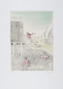 Giorgio De Chirico, L'arrivo del centauro. 1973. Acquatinta su velina applicata a carta. mm 440x320. Foglio: mm 700x505. Firmata a matita in basso a destra e numerata in basso a sinistra. Es. 45/99. Doppio timbro a secco in basso ai lati: uno dell'artista e uno di Alberto Caprini stampatore in Roma. (1)